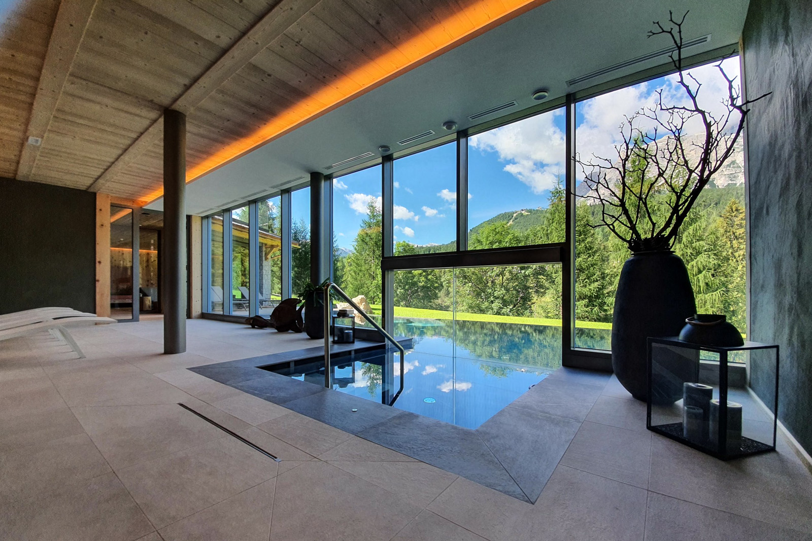 Oltre alla meravigliosa vista panoramica con piscina che abbraccia le Tofane, Croda da Lago, Becco di Mezzodì e Cadin, appena entrati nella struttura si viene rapiti dalla bellezza dell’interior design, estremamente sofisticato nonostante il legno naturale domini, ovviamente, la scena, utilizzato sia per i pavimenti che per la boiserie che ricopre le pareti.